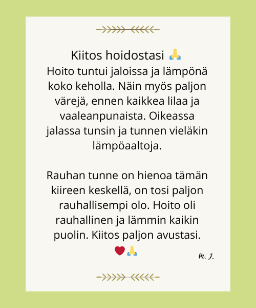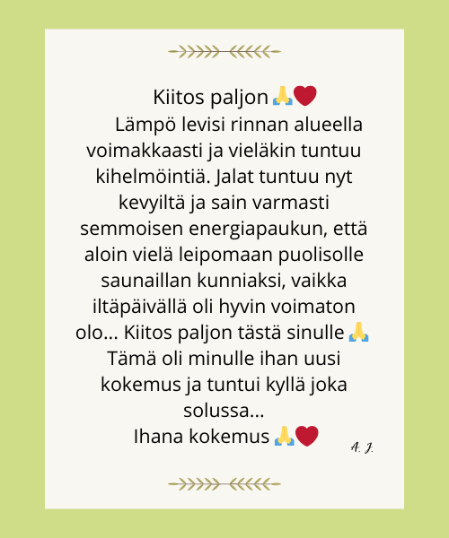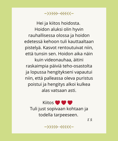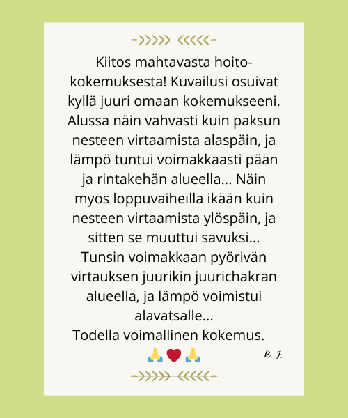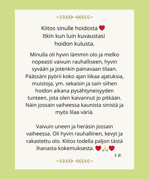 Saisitko vastaanottaa sen? Ota pieni hetki itsellesi ja antaudu reikin syleilyyn. Anna kehosi ja mielesi latautua lempeällä, parantavalla elämänenergialla, joka löytää tiensä juuri sinne, missä sitä eniten tarvitaan, saaden aikaan pieniä ja suuria ihmeitä.