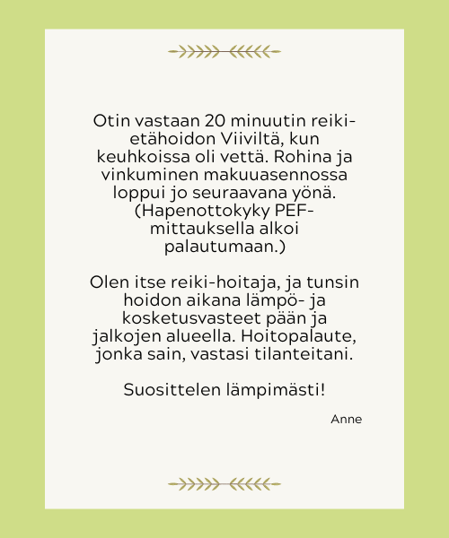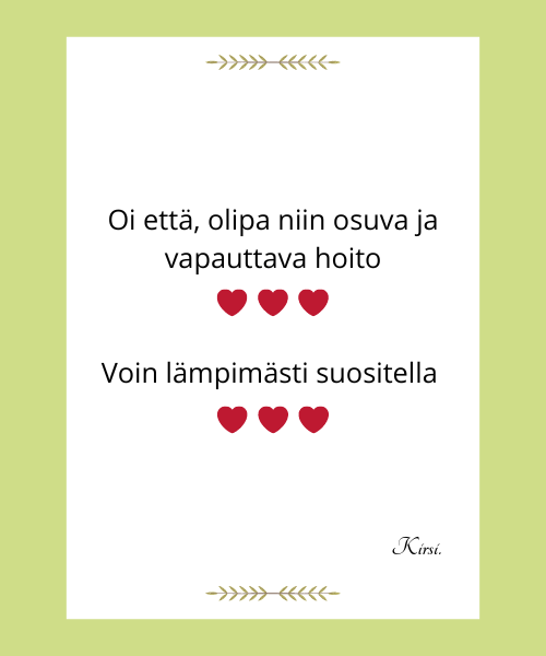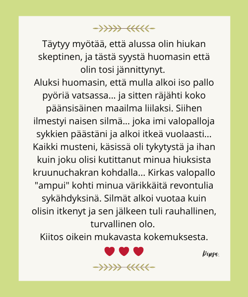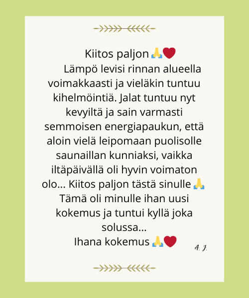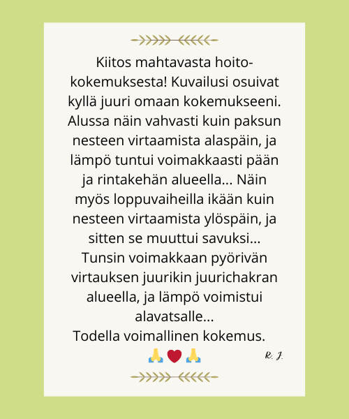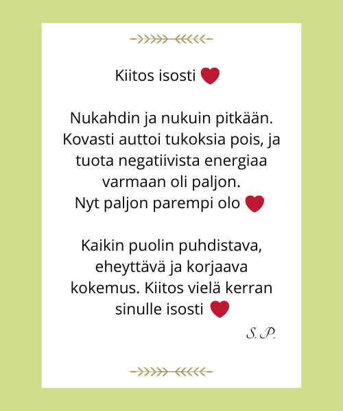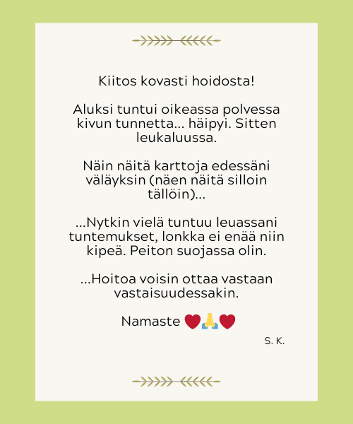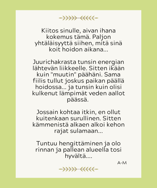 Olen koonnut tähän palautteita ihmisiltä, jotka ovat vastaanottaneet minulta etähoidon. Kuvauksista voit saada viitteitä siitä, mitä hoidolta voi odottaa.